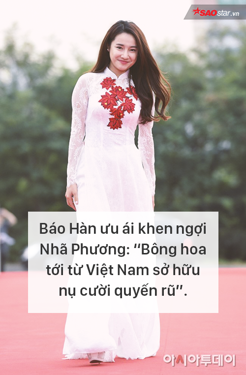 Không chỉ gây chú ý với khả năng nói tiếng Anh lưu loát, Nhã Phương còn ghi điểm trước truyền thông Hàn Quốc khi diện tà áo dài trắng dịu dàng tự tin bước đi trên thảm đỏ.