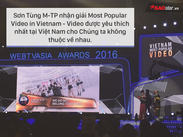 Cũng tại lễ trao giải WebTVAsia Awards 2016, dù không có mặt ở Hàn Quốc nhưng nam ca sĩ Sơn Tùng vẫn được vinh danh tại hạng mục Most Popular Youtube Video (Video phổ biến nhất tại Việt Nam) cho MV Chúng ta không thuộc về nhau. Với hơn 80 triệu lượt xem, MV của Sơn Tùng khiến nhiều người phải bất ngờ và ngưỡng mộ.