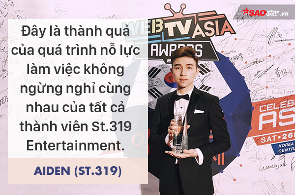 Giải thưởng này như một phần thưởng khích lệ ST.319 Entertainment nỗ lực hơn nữa trong hành trình chinh phục mục tiêu mà chúng tôi hướng đến - đó là làm ra những sản phẩm âm nhạc chất lượng phục vụ khán giả, và cùng các đồng nghiệp đưa ngành giải trí Việt Nam phát triển.” - Aiden chia sẻ cảm xúc.