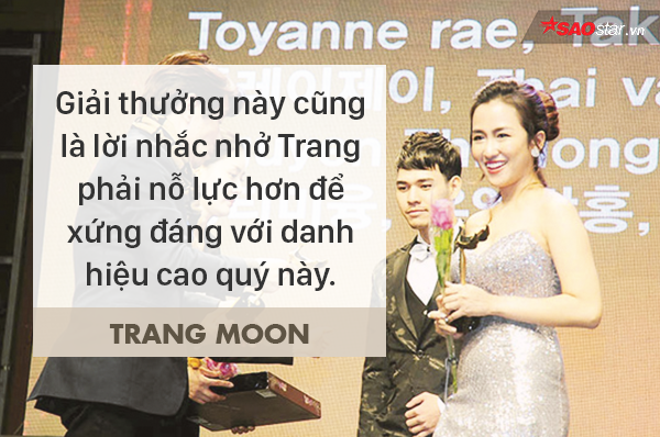 “Trang cảm ơn ban tổ chức giải thưởng Korean Culture Entertainment Awards và Hiệp hội Nhà báo Hàn Quốc đã bầu chọn danh hiệu cao quý này cho Trang. Đây là một dấu ấn trọng đại trong cuộc sống cũng như sự nghiệp nghệ thuật của Trang. Và giải thưởng này cũng là lời nhắc nhở Trang phải nỗ lực hơn để xứng đáng với danh hiệu cao quý này” - Trang Moon xúc động nói.