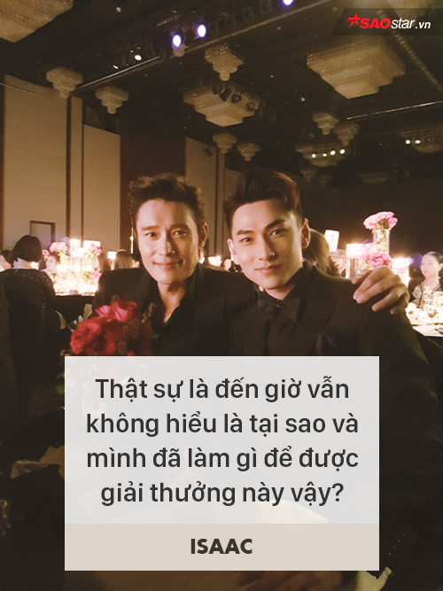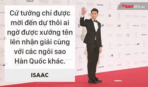 “Isaac vừa nhận được giải thưởng A Raising Star từ Asia Star Awards của Busan International Film Festival và Marie Claire magazine. Cứ tưởng chỉ được mời đến dự thôi ai ngờ được xướng tên lên nhận giải cùng với các ngôi sao Hàn Quốc khác. Thật sự là đến giờ vẫn không hiểu là tại sao và mình đã làm gì để được giải thưởng này vậy?” - Isaac cũng không quên chia sẻ cảm xúc trên trang cá nhân.
