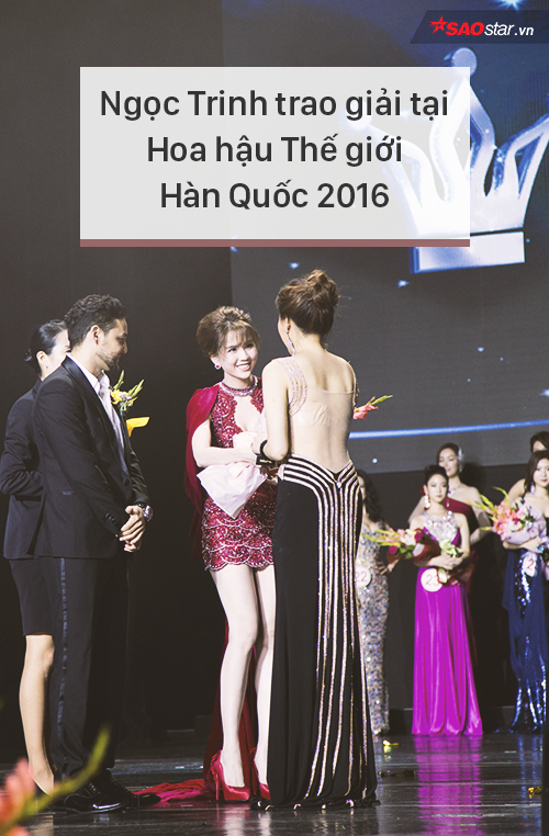 Không cần nhận thêm bất kỳ giải thưởng, Ngọc Trinh được mời tới xứ sở Kim Chi để trao giải cho tân Hoa hậu Thế giới Hàn Quốc 2016. Diện bộ váy quyến rũ, khoe đường cong cơ thể, Ngọc Trinh đẹp hút hồn trên sân khấu. Thậm chí, nhiều người đẹp Hàn Quốc còn phải ngưỡng mộ nhan sắc của Ngọc Trinh.