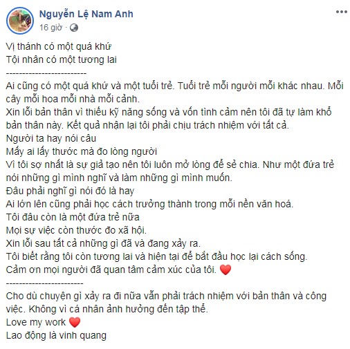 Trước những ý kiến của một số khán giả chưa hiểu rõ câu chuyện này, sau 2 ngày im lặng Nam Anh đã có những chia sẻ trên trang cá nhân của mình. Cô viết: “Vị thánh có một quá khứ. Tội nhân có một tương lai. Ai cũng có một quá khứ và một tuổi trẻ. Tuổi trẻ mỗi người mỗi khác nhau. Mỗi cây mỗi hoa mỗi nhà mỗi cảnh. Xin lỗi bản thân vì thiếu kỹ năng sống và vốn tình cảm nên tôi đã tự làm khổ bản thân này. Kết quả nhận lại tôi phải chịu trách nhiệm với tất cả.