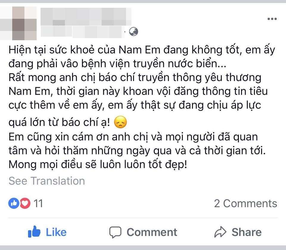 Trước đó, trên trang cá nhân, Nam Em gây xôn xao khi chia sẻ dòng trạng thái “chúc mọi người ngủ ngon” giữa ban ngày. Dù bài viết đã được gỡ bỏ, tuy nhiên, nhiều khán giả vẫn tỏ ra hết sức quan ngại cho tình trạng tâm lý của Hoa khôi Đồng bằng sông Cửu Long 2012 hiện tại.