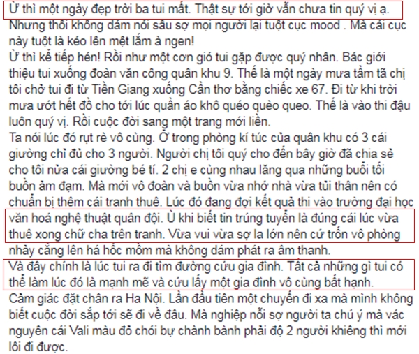 “Ừ thì một ngày đẹp trời, ba tôi mất. Thật sự tới giờ vẫn chưa tin quý vị ạ“, “Mới vô đoàn, vừa buồn vừa nhớ nhà vừa tủi thân nên có chuẩn bị thêm cái tranh thêu. Lúc đó đang đợi kết quả thi vào trường Đại học Văn hóa Nghệ thuật Quân đội. Khi biết tin trúng tuyển là đúng lúc vừa thêu xong chữ cha trên tranh” - Nam Em chia sẻ.