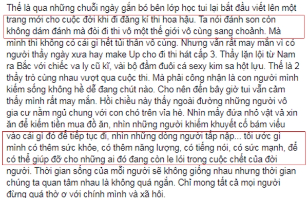 Cô nàng viết: “Đánh son còn không dám đánh mà đòi đi thi vô một thế giới vô cùng sang chảnh. Mình không có cái gì hết, tủi thân vô cùng nhưng vẫn rất may mắn vì có người thầy ngày xưa hay make-up cho đi thi hát cấp 3. Thầy lặn lội từ Nam ra Bắc với chiếc va ly cũ kĩ, vài bộ đầm đuôi cá kim sa hột lựu. Thế là 2 thầy trò cùng nhau vượt qua cuộc thi”.