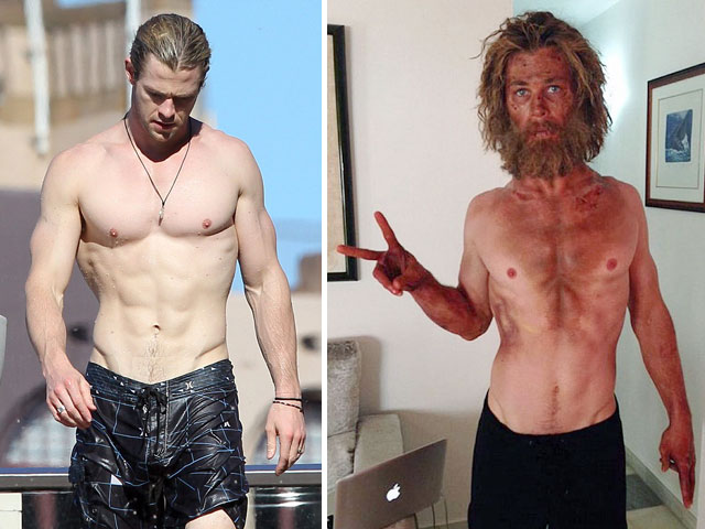 Khác với nhan sắc xuống cấp vì bê bối của Aaron Carter, “thần Sấm” Chris Hemsworth trở nên “xác xơ” vì phải ép cân cho vai diễn Owen Chase - một thủy thủ bị mắc kẹt trên biển trong 90 ngày trong bộ phim Heart of the Sea. Anh chỉ được phép nạp 500-700 calories/ngày trong 3-4 tuần. Kết quả, từ một anh chàng cơ bắp vạm vỡ, Chris trông èo ọt như một tàu lá chuối.
