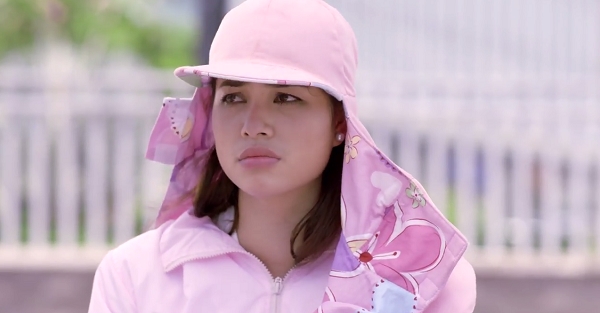 Vừa quay cảnh đẹp ngoài bãi biển nhưng Yến Nhi không quên bảo vệ làn da trắng của mình…