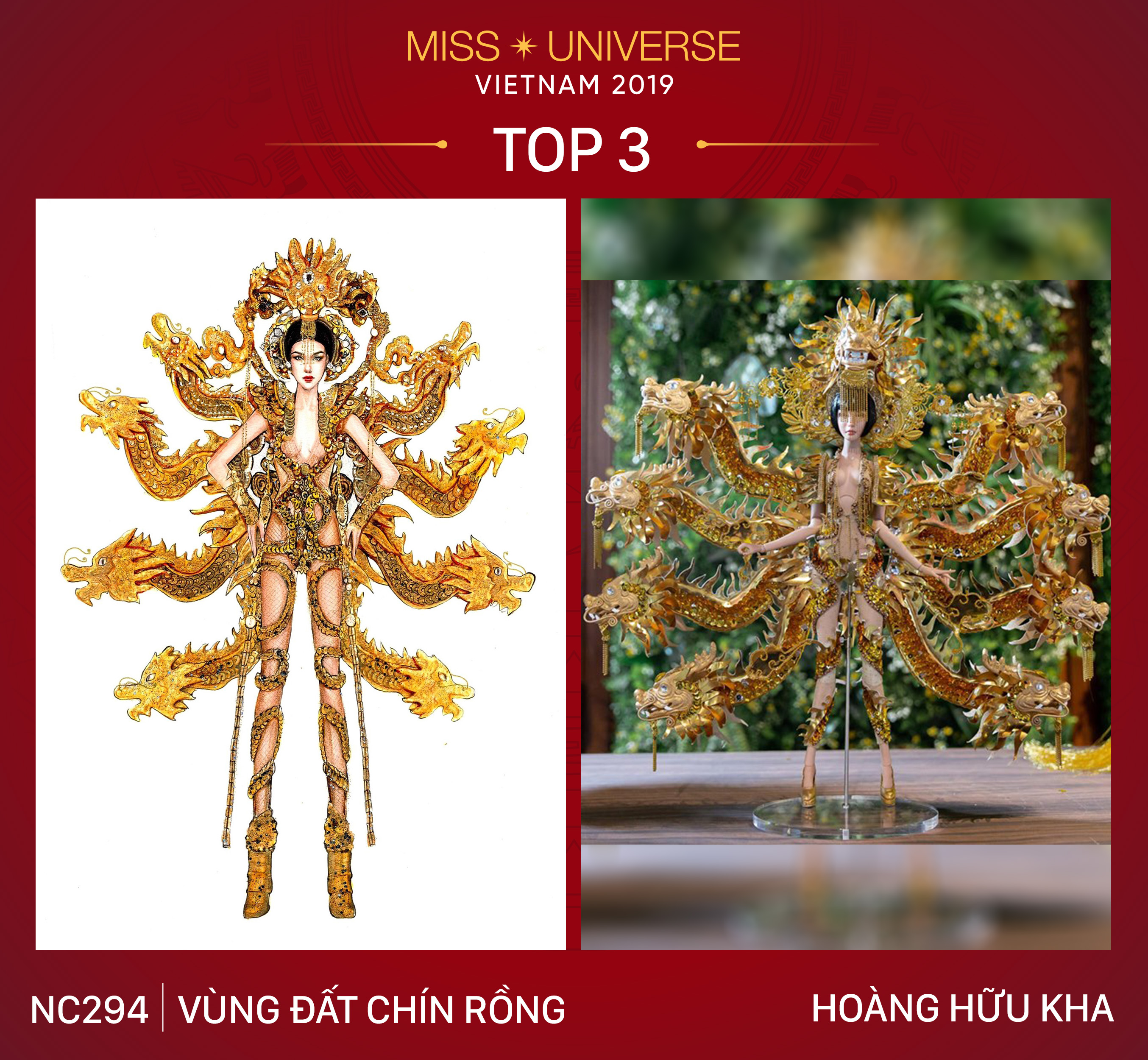 Khi hình ảnh mẫu mini của Top 18 được chia sẻ, “Vùng đất chín rồng” đã là thiết kế được nhiều fan dự đoán chắc chắn góp mặt trong Top 3. Tác giả Hoàng Hữu Kha gây ấn tượng mạnh với khả năng hoàn thiện tinh xảo từng chi tiết tạo nên mẫu National Costume đẹp mắt về cả màu sắc và độ cân đối.