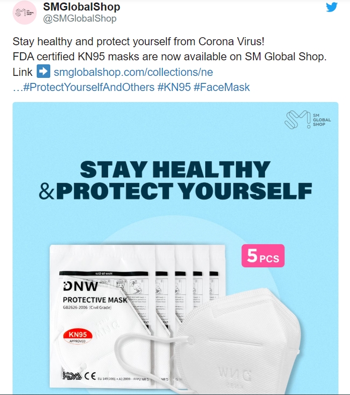 Mới đây, trang bán hàng chính thức của SM - SMGlobalShop đã đăng tải trên twitter thông tin giao bán những chiếc khẩu trang KN95 giữa mùa dịch COVID-19. Theo đó, hiệu quả của những chiếc khẩu trang này cũng tương đương với khẩu trang KF94 thường được bày bán phổ biến ở thị trường Hàn Quốc.