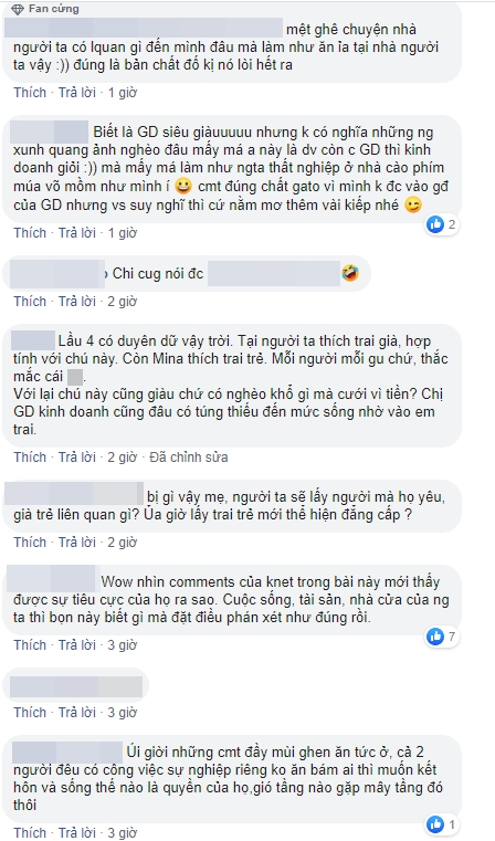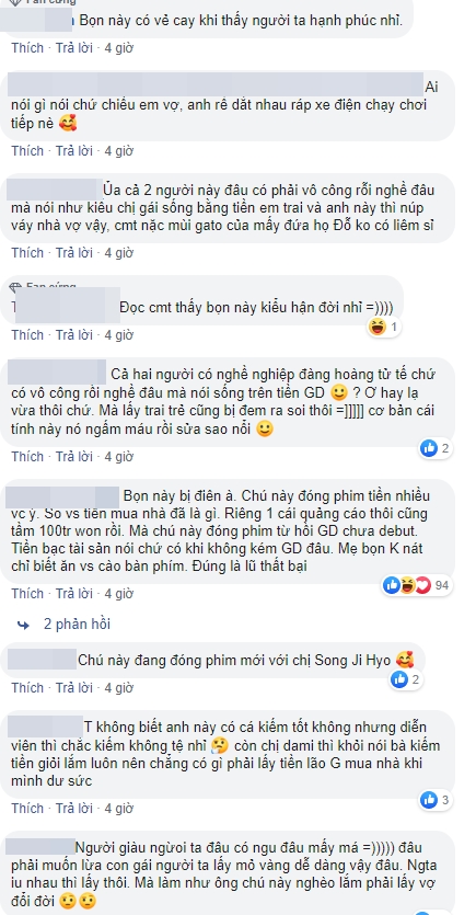 Trên mạng xã hội, không khó để nhìn thấy một số bình luận như:”Anh ta (Kim Myung Min) đúng là ghê gớm đấy, ghen tị thật”, “Anh ta được sống sang chảnh như vậy là nhờ lấy đúng người đấy, hoặc có thể nói là chọn đúng em vợ”, “Căn nhà mua bằng tiền của GD”, “Cá là anh ta lấy cô ấy vì tiền”,…