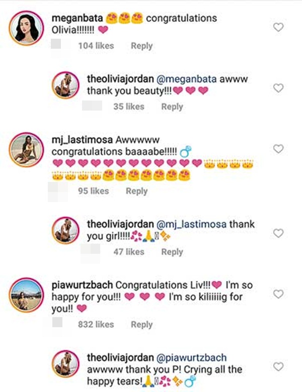 Vừa qua, Oliva Jordan - Á hậu 2 Hoa hậu Hoàn Vũ 2015 đã chính thức nhận lời cầu hôn của người yêu điển trai Jay Hector. Ngay sau khi thông tin được công bố trên mạng xã hội, nàng Á hậu với nụ cười tỏa nắng nhận được vô vàn lời chúc phúc từ các fans trên toàn thế giới. Bên cạnh đó, các nữ hoàng sắc đẹp khác cũng gửi nhiều lời chúc mừng đến Oliva Jordan.
