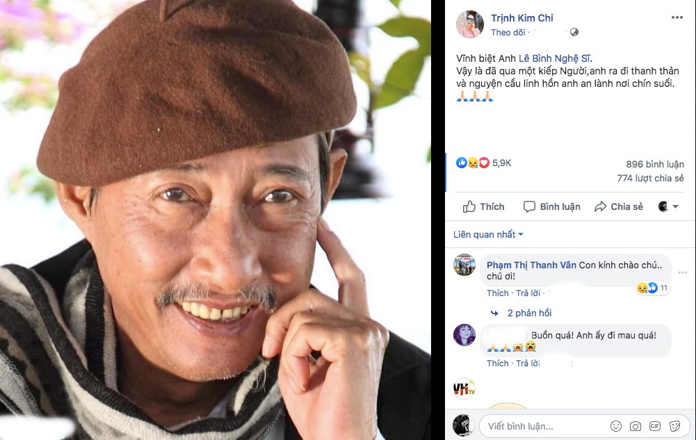 Nghệ sĩ Trịnh Kim Chi viết trên trang cá nhân: “Vĩnh biệt Anh Lê Bình Nghệ Sĩ. Vậy là đã qua một kiếp người, anh ra đi thanh thản và nguyện cầu linh hồn anh an lành nơi chín suối”.