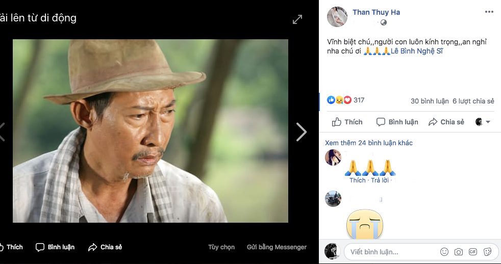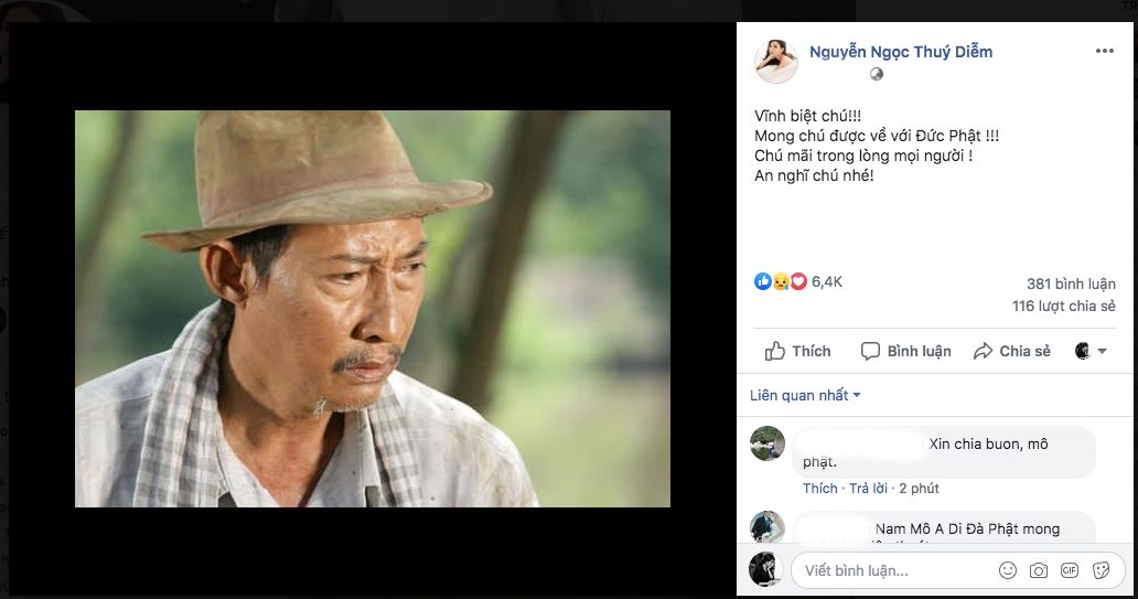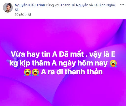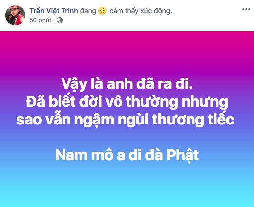 Nữ diễn viên Việt Trinh chia sẻ “Vậy là anh đã ra đi. Đã biết đời vô thường nhưng sao vẫn ngậm ngùi tiếc nuối. Nam mô ai di đà phật”.