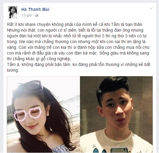 Cô viết: “Rất ít khi share chuyện không phải của mình kể cả khi Tấm là bạn thân. Nhưng nói thật, con người có sĩ diện, biết là lỗi tại đàn ông nhưng người đàn bà một khi bị nhắc nhở tử tế người thứ 3 thì người thứ 3 nên có tự trọng. Mẹ nào mà chẳng thương con nhưng một khi con sai thì im lặng là vàng. Còn với thằng trẻ con kia thì ừ đành hộp sữa còn chẳng mua nổi cho con mà rãnh đi đấu giá cái váy con đàn bà mặc. Sống giàu mà không sang thì chẳng khác gì gỗ công nghiệp. Tấm à, không đáng phải bận tâm, không đáng phải tổn thương vì những kẻ bất lương”.