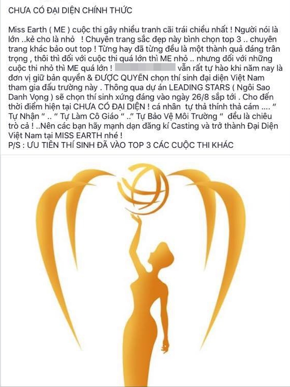 Mới đây, trên trang cá nhân của một người được cho là đang làm việc ở đơn vị truyền thông nắm bản quyền cuộc thi Miss Earth 2018, vừa đăng tải chia sẻ khiến dư luận xôn xao khi ngoài việc khẳng định chưa có đại diện mà còn có những ẩn ý được cho là đang có ý “đá xéo” Mâu Thủy. Cụ thể là người này bức xúc khẳng định lại về quy mô của đấu trường nhan sắc Miss Earth cũng như thông báo đầy “ẩn ý” hiện đang có nhân vật đang “tự nhận” là đại diện, “tự làm cô giáo”, “tự bảo vệ môi trường” để làm chiêu trò.
