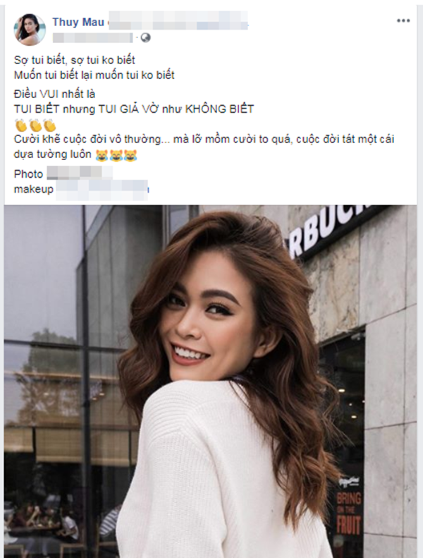 Ngay sau lùm xùm trên, Á hậu Mâu Thuỷ đã đăng tải một tấm ảnh trên Facebook cá nhân với lời bình: “Sợ tôi biết, sợ tôi không biết… Tôi biết nhưng lại giả vờ không biết. Cười khẽ cuộc đời vô thường… mà lỡ mồm cười to quá, cuộc đời tát một cái dựa tường luôn”.