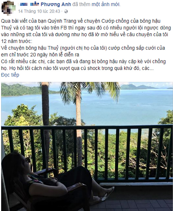 Theo đó, người này viết: “Thật chẳng tự hào gì khi phải viết lên những dòng chữ này để nói về người thân, người chị họ của mình. Nhưng tôi thương và đồng cảm với tất cả những người phụ nữ đã và đang phải chịu đựng nỗi đau giống tôi của 12 năm về trước. Nỗi đau của tôi, không biết làm sao diễn tả khi người cướp chồng lại là chị họ mình”.