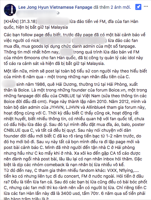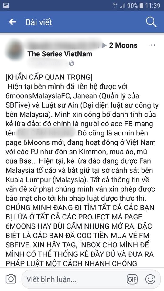 Cụ thể, người này có tên B.C.N (biệt danh C) trong quá trình lừa đảo bán vé FM của nhóm 6moons cho fan Hàn thì bị công ty quản lý của những thần tượng này tố cáo ra cảnh sát và hiện đang bị bắt giữ tại Malaysia.