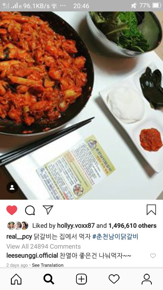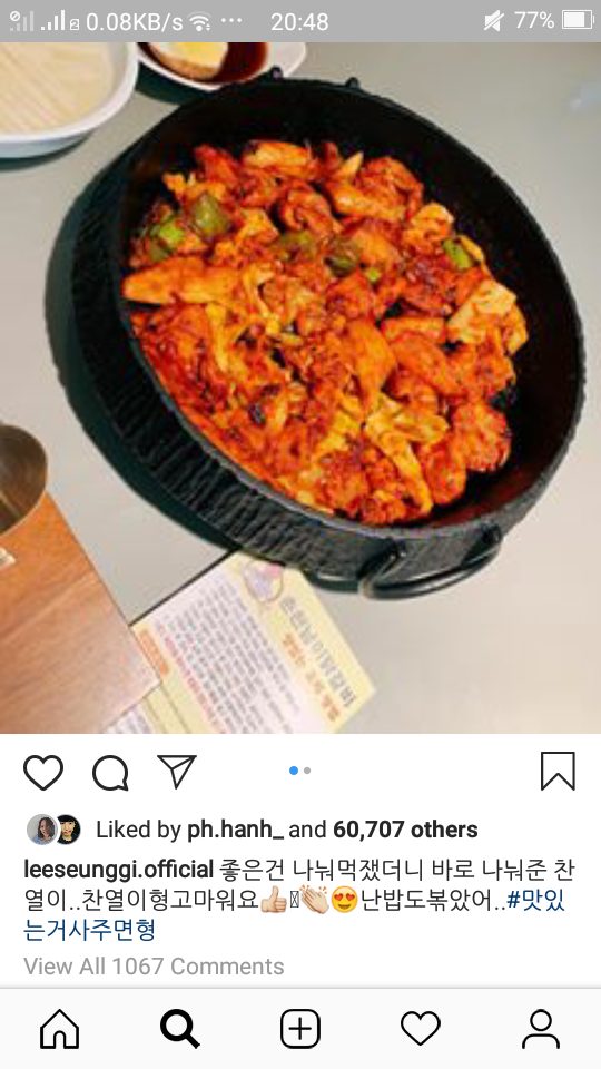 Ngày 7/3, trên Instargram của Chanyeol đăng tải bức ảnh món sườn gà cay đã thu hút được sự chú ý của “tề thiên đại thánh” Lee Seung Gi. Nam diễn viên liền để lại comment dưới bức ảnh: “Chanyeol à, có đồ ăn ngon thì mình nên chia sẻ cho nhau á ~~”. Nhận được tín hiệu từ “ngộ không”, chàng trai Chanyeol 2 ngày sau liền đến quán gà mua 1 suất y chang gửi đển Seung Gi.