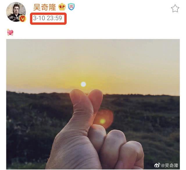 Trong ảnh, Ngô Kỳ Long “bắn tim” với ông mặt trời ở ngoài đằng xa để gửi sự yêu thương từ xa đến Lưu Thi Thi, nhiều người sau khi xem xong hình đã không nhịn được nói: Thật lãng mạn!