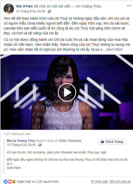“Có cơ hội được đồng hành với chị tại cuộc thi và các hoạt động của Hoa hậu Hoàn vũ Việt Nam, Hen nhận thấy, thành công của chị Thuỳ không tự dưng mà có. Hen cảm nhận rất rõ nghị lực phi thường từ chị ấy, là sự xuất phát từ chính ước mơ thôi thúc đến động lực, dám bỏ qua những định kiến, gièm pha của xã hội mà đi lên khẳng định chính mình, LÀM ĐIỀU PHI THƯỜNG. Và Chị Thùy, cũng chính là người chị, người đồng nghiệp đã truyền nguồn cảm hứng mạnh mẽ đến Hen”.