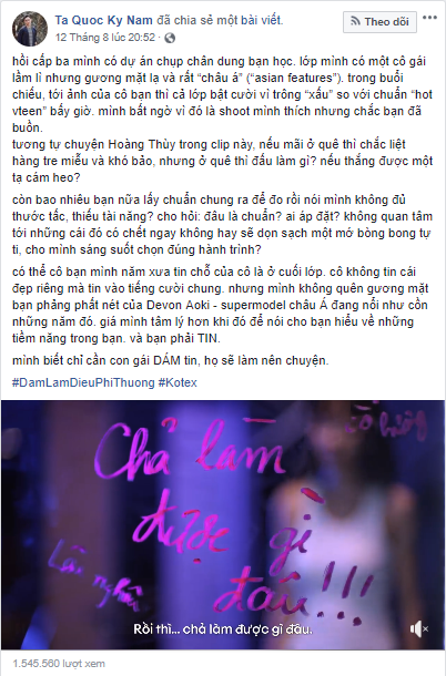 Tạ Quốc Kỳ Nam, chàng trai 9x đa tài, hài hước và cá tính cũng đã nhiều lần “dám” thử sức mình với đôi ba ngã rẽ. Là chủ nhân của hàng chục bìa sách, hàng trăm ideas sáng tạo thú vị, nhưng anh cũng phải gánh chịu không ít lời dèm pha. Thông qua câu chuyện của Hoàng Thùy, Kỳ Nam lại liên tưởng tới cô bạn học chung cấp ba của mình cùng suy nghĩ “chỉ cần con gái dám tin, họ sẽ làm nên chuyện”.