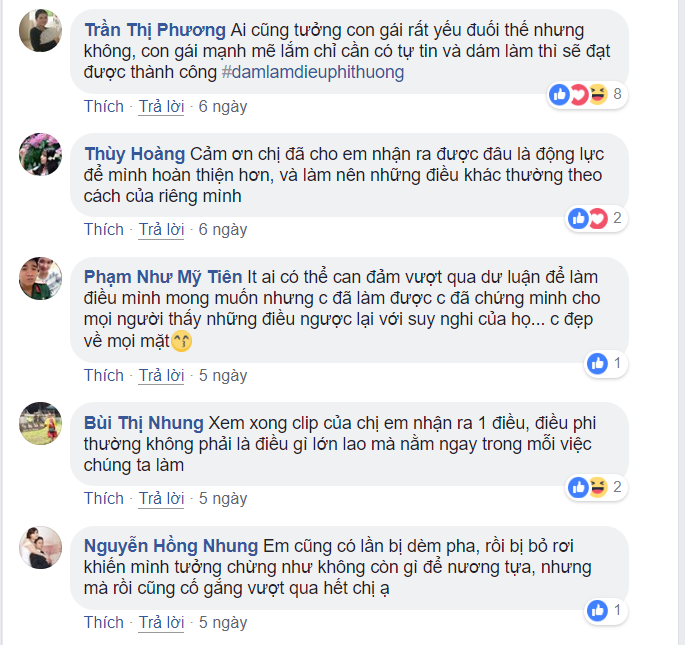 Khánh Vy, Tiên Tiên, nhà văn Tuệ Nghi, cơ trưởng Huỳnh Lý Đông Phương… những cô gái cũng đã vượt qua rất nhiều trở ngại để thành công trên con đường mà mình chọn cũng đồng loạt có những chia sẻ về câu chuyện của Tóc Tiên, Hoàng Thùy. Và tất cả dường như đều có điểm chung là thấy chính mình trong câu chuyện đó, những người phụ nữ dám làm những điều phi thường và luôn kiên định trên con đường mình đã chọn.