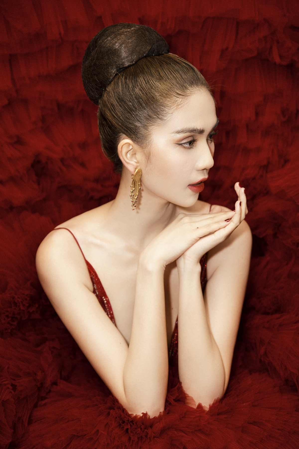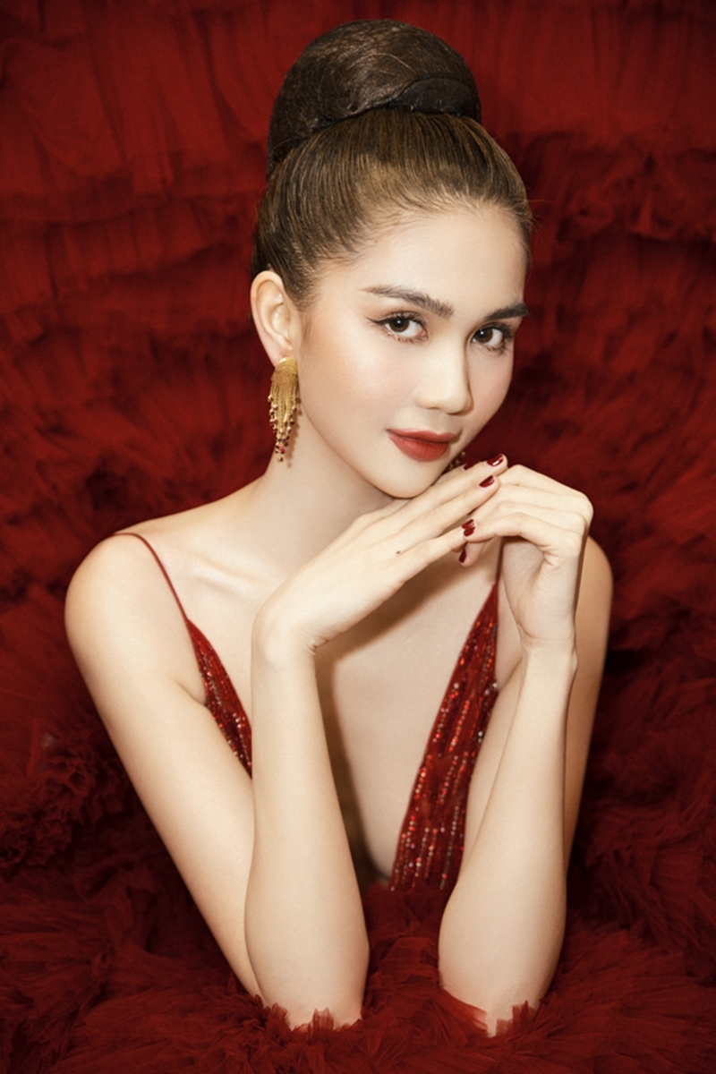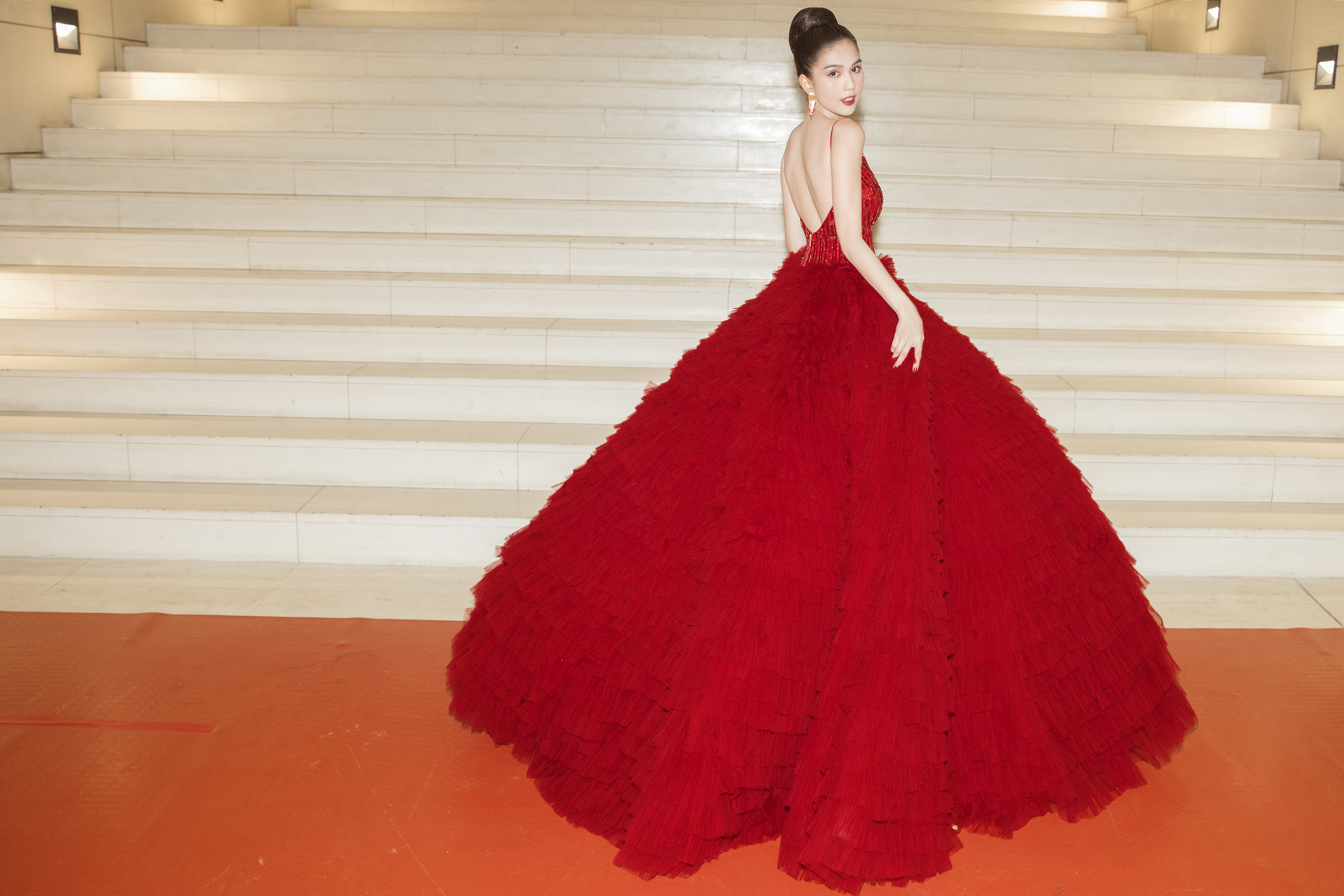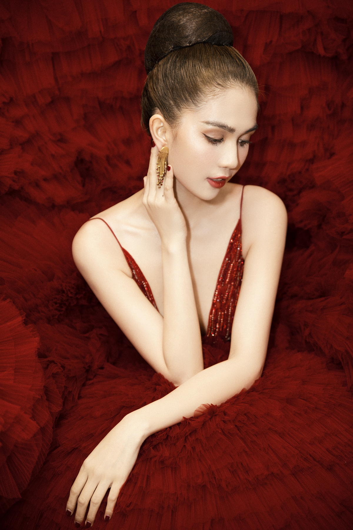 Xuất hiện tại sự kiện, Ngọc Trinh chiếm trọn “spotlight” khi diện bộ đầm đỏ hở vai gợi cảm. Dáng váy xòe rộng, phần ngực lấp lánh được cắt xẻ tinh xảo khiến cô nàng có thể tự nhiên khoe trọn đường cong cơ thể. Đặc biệt, sắc đỏ của bộ trang phục càng tôn lên nước da trắng ngần, vừa gợi cảm, kiêu sa vừa khiến Ngọc Trinh trông càng thêm quyền lực.