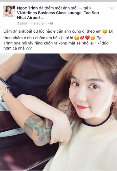 “Cảm ơn anh, bất cứ lúc nào em cần anh cũng đi theo em. Đi theo chăm em như chăm em bé vậy. Trinh nghe nói lấy răng khôn ra xong mặt sẽ nhỏ lại 1 xí đúng không cả nhà” - Ngọc Trinh viết.