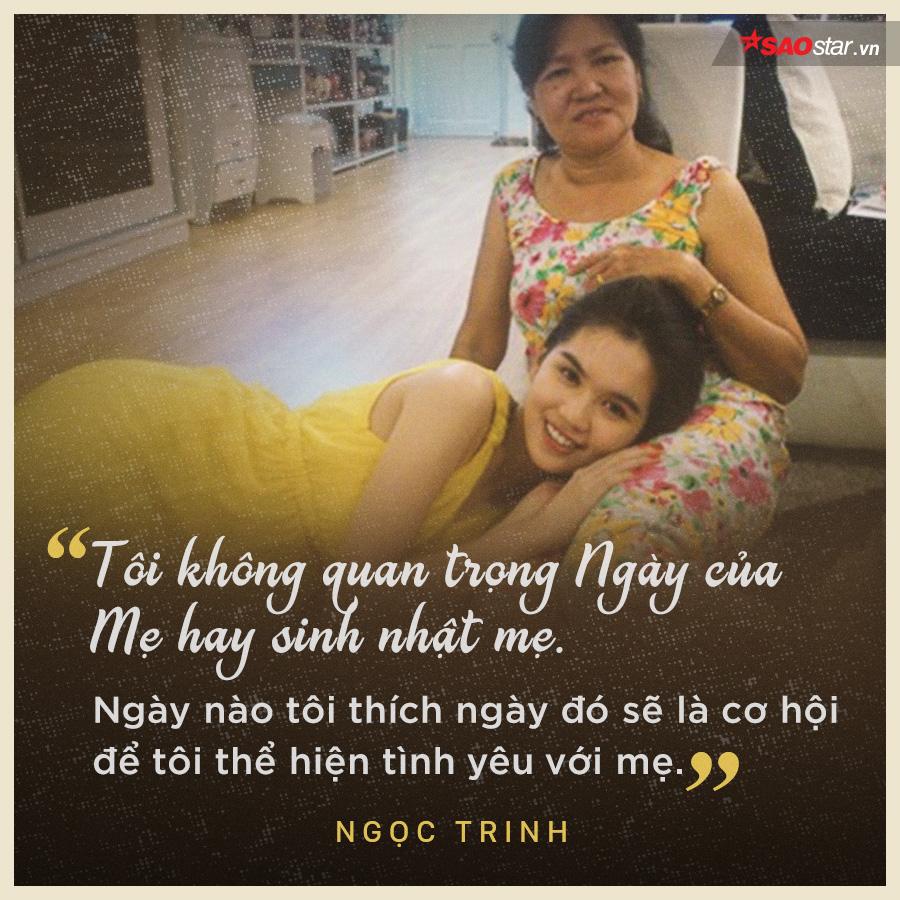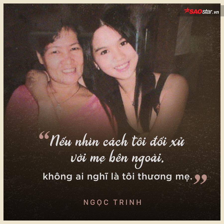 Ngọc Trinh không phải là một người con lý tưởng. Cũng như bao người khác, cô từng làm những điều có lỗi với mẹ. Quát mắng mẹ khi nóng giận, bận rộn với cuộc sống cá nhân mà vô tâm quên cả những khoảnh khắc cần đến sự quan tâm và chia sẻ… Nói thế để thấy, Ngọc Trinh cũng chẳng khác chúng ta là bao. Điều khác biệt duy nhất là Trinh luôn tự tin nói ra những lỗi lầm mà với người khác tưởng chừng như rất khó để giãi bày.