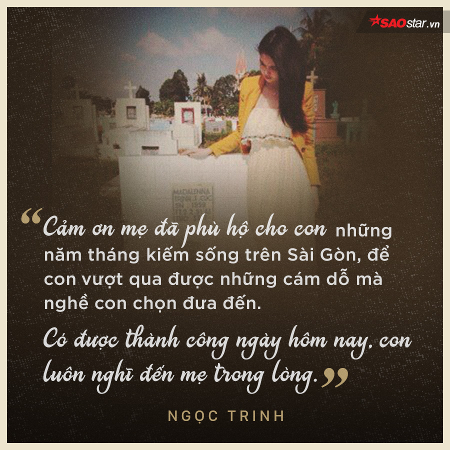 Sẽ rất thiếu sót nếu Ngọc Trinh không nhắc đến người mẹ ruột đã qua đời. Dù không có ký ức gì về đấng sinh thành nhưng Trinh từng được những người xung quanh nói lại rằng mẹ của cô rất đẹp và hiền. Ngọc Trinh luôn chọn nhớ đến mẹ đầu tiên mỗi khi cô rơi vào bước đường khó khăn hay đối mặt với những đau khổ tưởng chừng không vượt qua được. Những khi vượt qua hoạn nạn hay gặp may mắn bất ngờ trên đường đời, giống như một phản xạ bản năng, trong lòng Trinh đều có mẹ. “Nhờ có mẹ trên cao phù hộ, tôi mới được như ngày hôm nay. Từ một đứa con gái dưới quê lên ham tiền, mê tiền, vì sao tôi lại né được những cạm bẫy? Sức một mình tôi làm sao cưỡng lại nổi cám dỗ đồng tiền? Tất cả là nhờ mẹ…”.