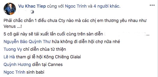 Vũ Khắc Tiệp chia sẻ rằng “Phải chắc chắn 1 điều chưa công ty nào mà các chị em thương yêu nhau như Venus… 5 cô gái này sẽ tái xuất lần cuối cùng trên sàn diễn. Nguyễn Bảo Quỳnh Thư hứa không đi diễn hội chợ nữa nhé. Tường Vy chỉ diễn chùa từ thiện. Lê Hà tham gì lễ hội Kông Chiêng Gialai. Quỳnh Hương diễn tại Cannes. Ngoc Trinh sinh babi”.
