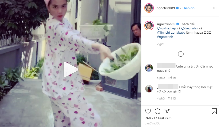 Cụ thể trên Instagram cá nhân, Ngọc Trinh đã đăng tải 1 video hài hước, thể hiện kỹ năng vẩy rau siêu đỉnh của mình. Điều đặc biệt là, không chỉ vẩy rau theo cách thông thường, cô nàng còn khiến nhiều người “mắt tròn mắt dẹt” khi cao hứng múa hẳn 1 vũ điệu…vẩy rau. Trước khả năng đặc biệt này, Ngọc Trinh còn mạnh dạn thách đấu Diệu Nhi, Khắc Tiệp và á hậu Linh Chi tham gia vào thử thách cùng mình.