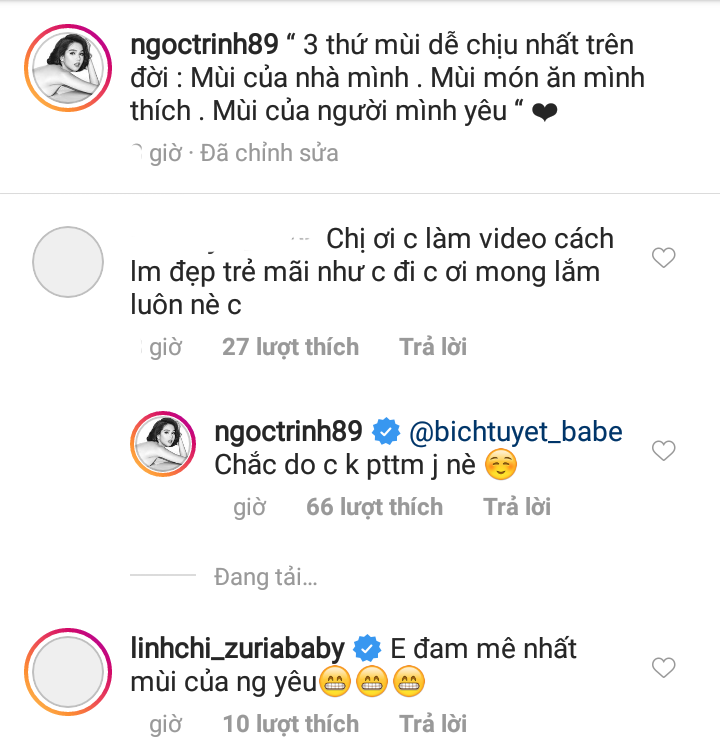 Thời gian gần đây, trên kênh Youtube cá nhân Ngọc Trinh thường xuyên chia sẻ cuộc sống hằng ngày, bởi vậy có khán giả đã đặt câu hỏi mong muốn người đẹp làm video chia sẻ bí quyết trẻ mãi không già. Nữ hoàng nội y khéo léo phản hồi: “Chắc do chị không phẫu thuật thẩm mỹ”.