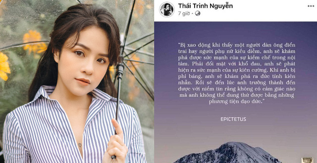 Khoảng 3h sáng (6/4), trên trang cá nhân, Thái Trinh tiếp tục mượn lời sưu tầm trên mạng xã hội ẩn ý việc có người thứ 3 xen vào cuộc tình giữa cô và Quang Đăng. Cụ thể, nữ ca sĩ viết: “Bị xao động khi thấy một người đàn ông điển trai hay người phụ nữ kiều diễm, anh sẽ khám phá được sức mạnh của sự kiềm chế trong nội tâm.
