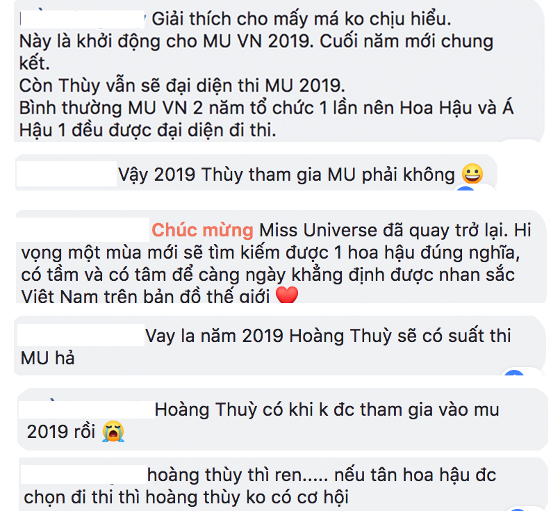 Tuy nhiên, Ông Trần Ngọc Nhật - Trưởng ban tổ chức Hoa hậu Hoàn vũ Việt Nam 2019 cho biết: “Chúng tôi hoàn toàn tự tin và đã sẵn sàng bước tiếp trên hành trình tìm kiếm Hoa hậu mới kế thừa thành công của Hoa hậu Thùy Lâm, Phạm Hương, H’Hen Niê cũng như phát huy tinh thần của Miss Universe - đó là lựa chọn một cô gái không chỉ tự tin, hiện đại và quyến rũ, mà còn sở hữu khả năng truyền cảm hứng sâu sắc đến cộng đồng. Các tiêu chí tuyển chọn của Hoa Hậu Hoàn Vũ Việt Nam 2019 sẽ được chúng tôi chia sẻ chi tiết hơn trong Họp báo công bố khởi động cuộc thi dự kiến được tổ chức vào tháng 04/2019″.