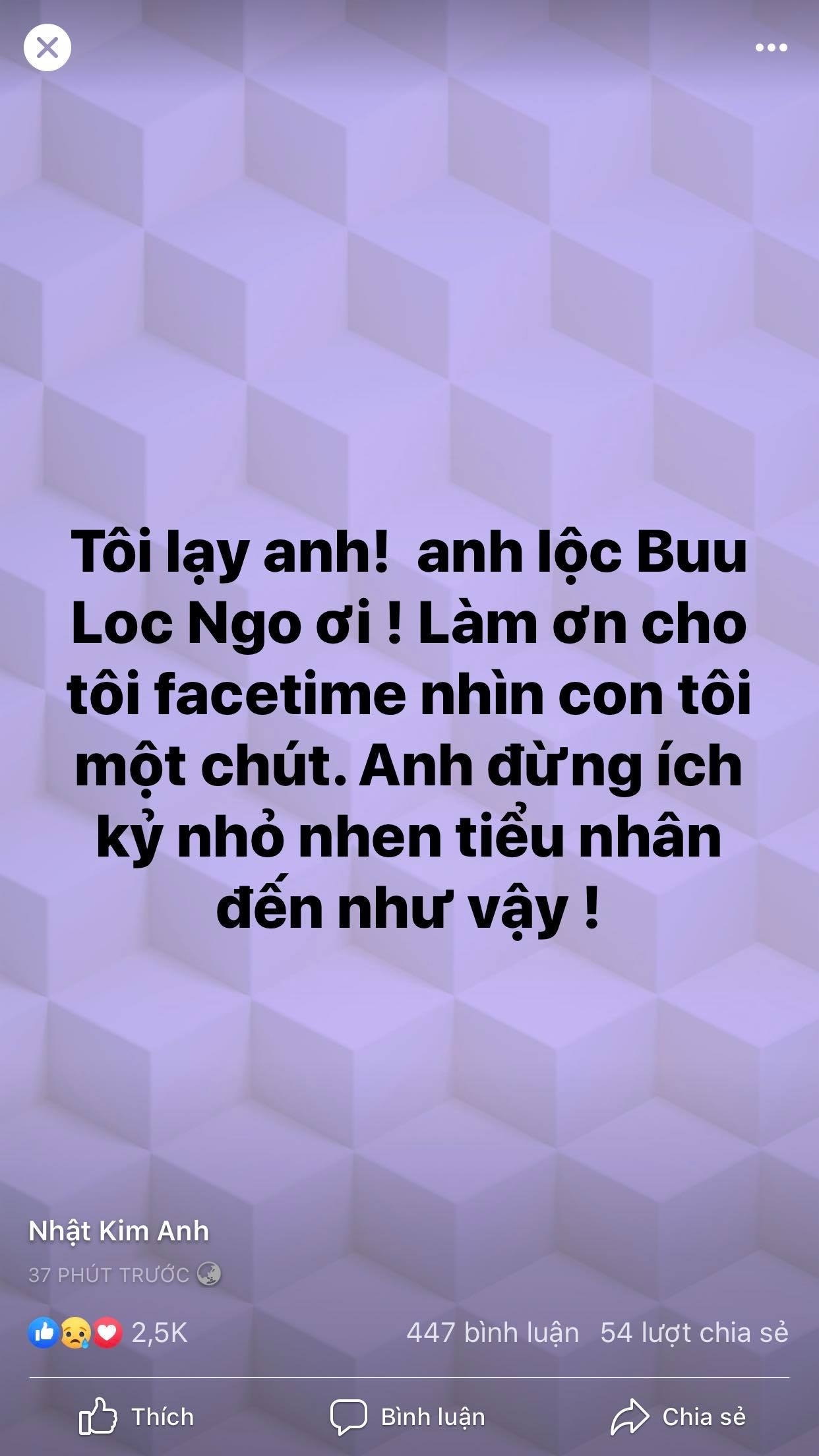 Cô viết: “Tôi lạy anh! anh lộc Buu Loc Ngo ơi ! Làm ơn cho tôi facetime nhìn con tôi một chút. Anh đừng ích kỷ nhỏ nhen tiểu nhân đến như vậy !”