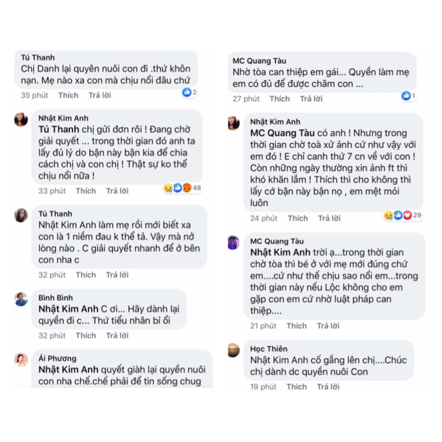 Ngay lập tức, fan hâm mộ và người quen hâm mộ đã vào động viên và an ủi cho cô, hy vọng nàng Thị Bình sớm được gặp mặt con và giành được quyền nuôi con. Qua đó, cô chia sẻ thêm rằng đã nhờ đến sự can thiệp của tòa án nhưng trong thời gian chờ toà xử, chồng cũ cứ như vậy với cô. Nữ diễn viên chỉ “canh” thứ 7 và chủ nhật về với con, còn những ngày thường thì khó khăn lắm. Khi nào thích thì cho không thì lấy cớ bận này bận, gây khó dễ với Nhật Kim Anh.