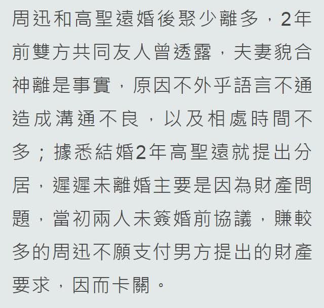 Theo đó, cả hai kết hôn nhưng chưa hề ký kết hợp đồng tiền hôn nhân. Sau khi nên vợ thành chồng, cặp đôi nổi tiếng hiếm khi ở bên nhau, xa mặt cách lòng. Vì tính cách không hợp, thêm vào đó bất đồng ngôn ngữ nên khiến tình cảm giữa Châu Tấn và Cao Thánh Viễn sứt mẻ, đổ vỡ. Về việc cả hai ly thân 2 năm mới chịu ly hôn là do rắc rối về chuyện chia tài sản. So với chồng, Châu Tấn thu nhập cao hơn rất nhiều. Chính vì thế, cô không đồng ý chia một nửa tài sản trong quá trình hôn nhân cho Cao Thánh Viễn.