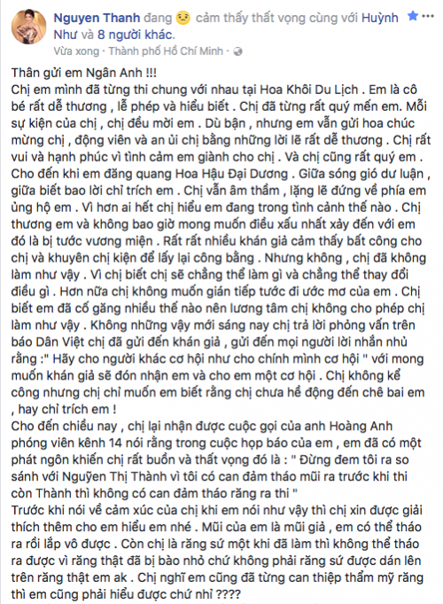 Khi đọc được những chia sẻ của chân dài gốc Bắc Ninh, Lê Âu Ngân Anh đã viết một bức “tâm thư” khá dài để giải thích về phát ngôn của mình trong buổi họp báo. Người đẹp cho biết lúc bị “tấn công” dồn dập bởi những câu hỏi khó, tâm lý không vững vàng nên đã để xảy ra hiểu lầm vì chưa thể hiện câu trả lời tròn vành rõ chữ. Đồng thời, bản thân cũng gửi lời xin lỗi đến Nguyễn Thị Thành vì sự việc không đáng có này.