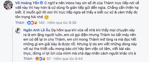 Theo đó, Võ Hoàng Yến cho rằng không nhất thiết mọi người phải biết, chỉ cần Ngân Anh muốn gửi lời xin lỗi trực tiếp thì Á hậu Miss Eco International sẽ thấy được đàn em biết cách cư xử cũng như cảm thấy được sự tôn trọng.