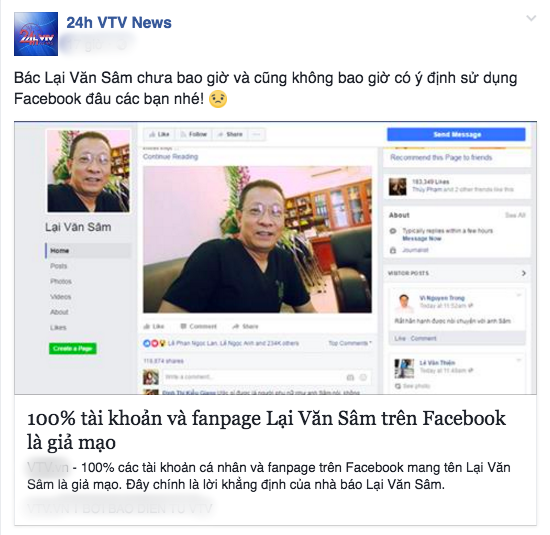 VTV khẳng định 100% tài khoản và fanpage Lại Văn Sâm trên Facebook là giả mạo.