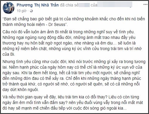 Bên cạnh đó, Nhã Phương cũng bất ngờ chia sẻ dòng trạng thái đầy ẩn ý lên trang cá nhân. Những tâm tư đầy cảm xúc của cô thu hút sự quan tâm lớn từ khán giả. Nhiều người suy đoán, phải chăng nữ diễn viên 28 tuổi đang ám chỉ mối quan hệ rạn nứt với Trường Giang.