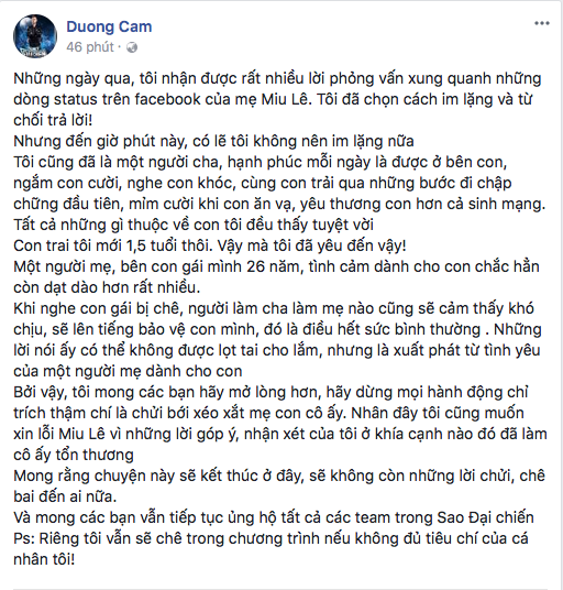 Trước những từ ngữ có phần khá nhạy cảm, mới đây, nhạc sĩ Dương Cầm có những trải lòng về sự việc lùm xùm trên. Với tư cách của một người đã có con, anh hoàn toàn hiểu và thông cảm trước ý kiến có phần hơi quá khích của mẹ Miu Lê.