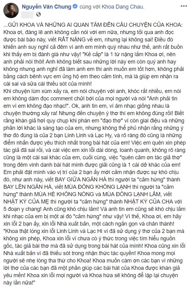 “Khoa thật lòng xin lỗi Linh Linh và Lạc Hi vì đã sử dụng ý thơ của 2 bạn mà không xin phép, Khoa xin lỗi vì chưa có ý thức trong việc tìm hiểu nguồn gốc, tác giả bài thơ mà đã sử dụng trong bài hát của mình! Khoa cũng xin lỗi Nhà xuất bản vì đã thiếu sót trong nhận thức tác quyền! Khoa mong mọi người sẽ nhẹ lòng tha thứ cho Khoa! Khoa muốn cám ơn các bạn vì những lời thơ của các bạn đã một phần giúp các bài hát của Khoa được khán giả yêu mến! Khoa xin lỗi mọi người và Khoa hứa sẽ không để lặp lại chuyện này lần nữa!”