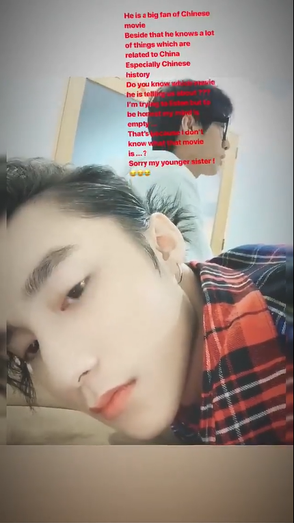 Sơn Tùng chia sẻ: “Anh ấy (chỉ stylist) là một fan bự của những bộ phim Trung Quốc. Bên cạnh đó anh ấy cũng biết khá nhiều về những sự kiện lịch sử của người Trung Quốc. Bạn có biết bộ phim mà anh ấy đang nói đến không? Mình đã cố gắng nghe và hiểu nó nhưng điều đó là không thể. Bởi mình không hề biết bộ phim đó là như thế nào…Sorry my younger sister.”