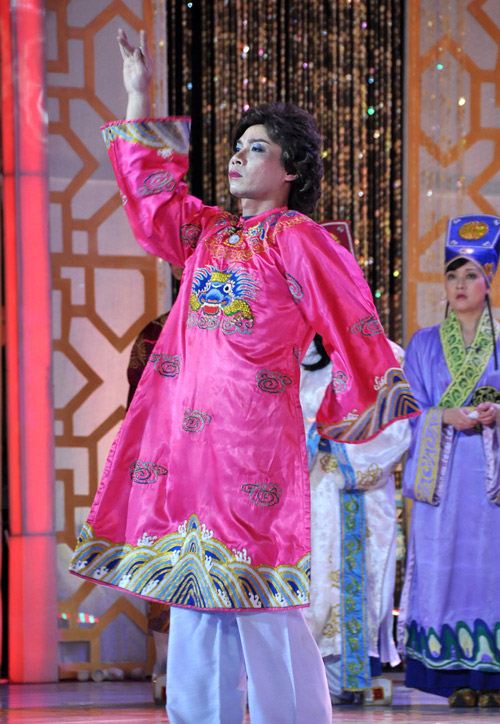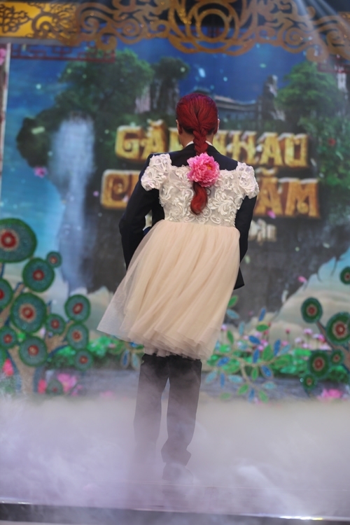 2014 lại càng được đầu tư hơn khi “cô Đẩu” thay đến tận 3 bộ trang phục trong đêm diễn. Đầu tiên là một chiếc áo dài gấm màu hồng, đeo băng đô đỏ…