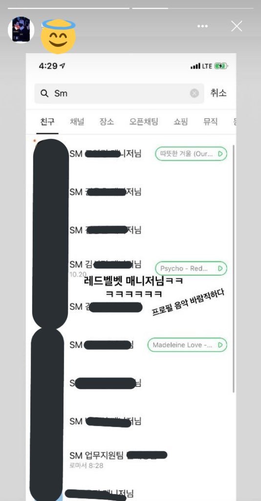Một bài đăng khác trên story trên Instagram cho thấy nhân viên thuộc công ty bảo vệ này đã tự hào khi khoe ảnh chụp màn hình danh sách liên lạc của mình. Trong đó, màn hình hiển thị nhiều số liệu khác của SM Entertainment. Bài đăng có nội dung: “Người quản lý của Red Velvet. Nhạc nền trong hồ sơ của họ đúng với tính cách”.
