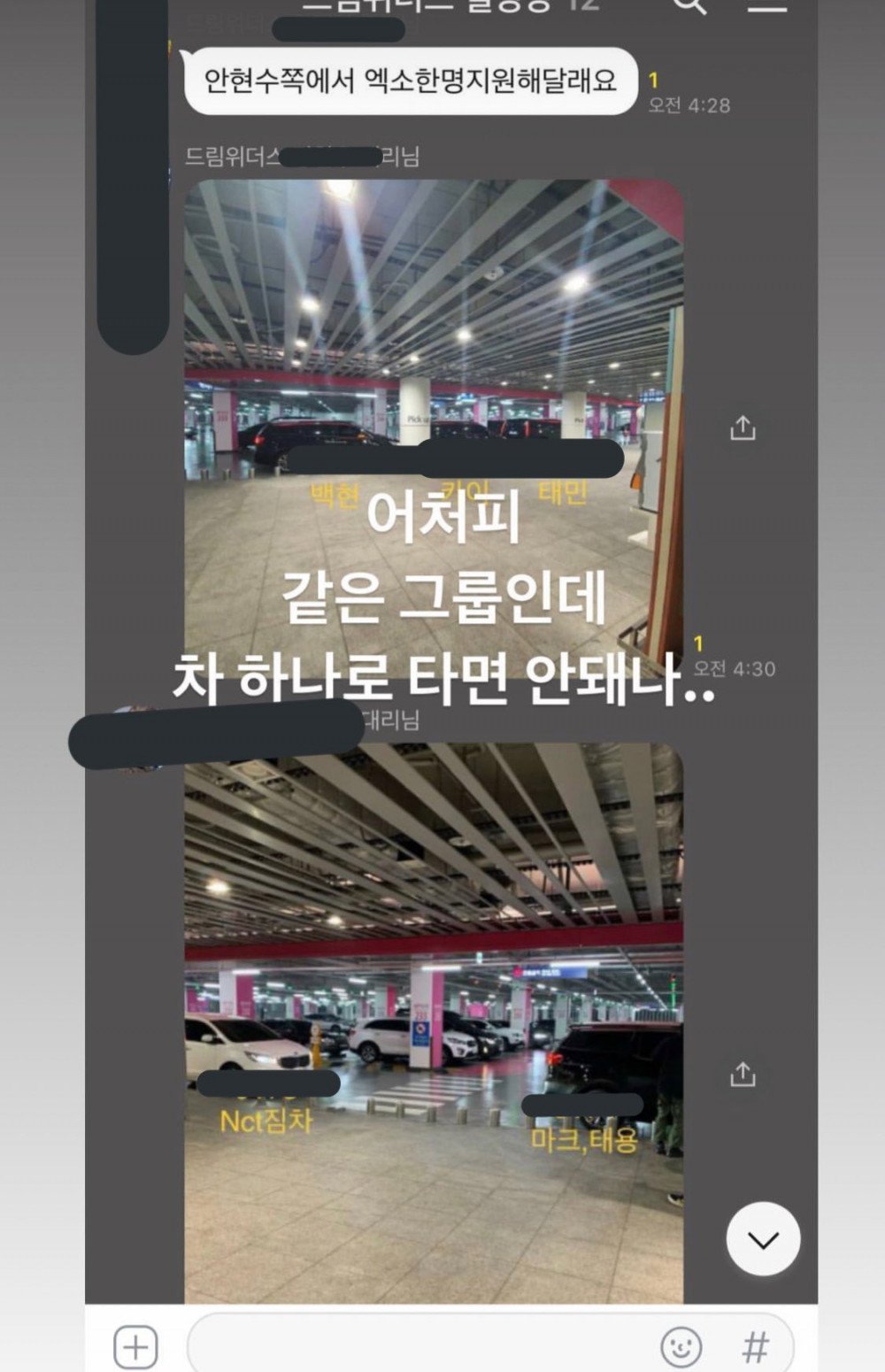 Người hâm mộ cũng phát hiện anh ta đăng ảnh các phương tiện giao thông của các thành viên SuperM được dán nhãn với phương tiện được chỉ định của từng thành viên (tức là Baekhyun, Kai, Taemin, hành lý của NCT, Mark và Taeyong) như những gì các bạn có thể thấy bên dưới. Tin nhắn nhận được có nội dung: “Họ đang yêu cầu một thành viên hỗ trợ khác từ EXO”. Phía trên các tin nhắn trao đổi, nhân viên phàn nàn: “Tất cả bọn họ đều là thành viên của một nhóm, ủa rồi có chết chóc gì khi ngồi cùng một chiếc xe”.